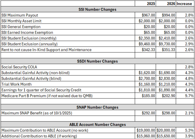 As happens every year, Social Security and the IRS have updated certain numbers that affect individuals with disabilities. While the Social Security COLA was 2.5%, increases to other numbers may be based on different factors. Below please find some of the number changes that go into affect on 1/1/2025: